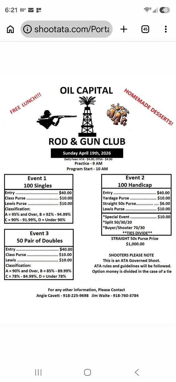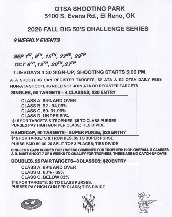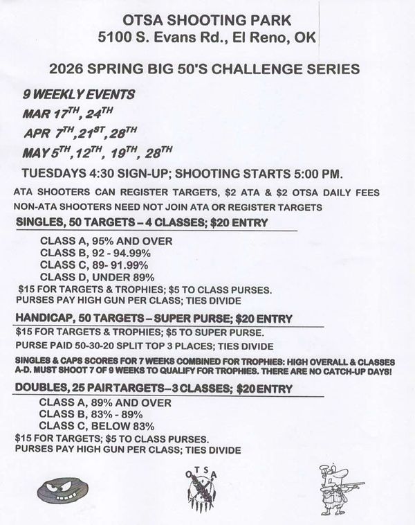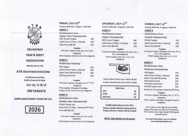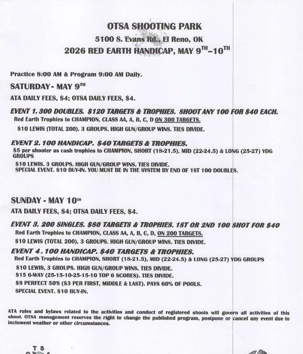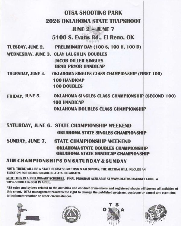 Here are some of our winners to mention a few. We know that Corbin Gybrowski shot 100 in the BJ Clark Singles winning AA Class. Kaden Kennedy won Long Yardage in the Lonestar Handicap. Addison Darling won JR in Lone Star Handicap, Corley Steward took Middle Yardage in the Texas Shooters Memorial Handicap. Dakota Andrews won Sub Jr in that same event. Rod Oyer won Sr Vet also. Stan Crawford took Sr Vet in the Singles Championship and Cambridge Miller won Jr in that event. Carol Brown won Lady 2 non resident in the Singles Championship. Dason Harmon won nonresident handicap yardage events. Rickey McCauley won Subvet trophies in singles and handicap events. We are sure there are several we missed, because our Oklahoma Shooters did very well in Texas! Congratulations Folks!!